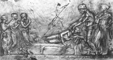 Fifth Century tablet of Aesculapius manipulating upper thoracic spine. From